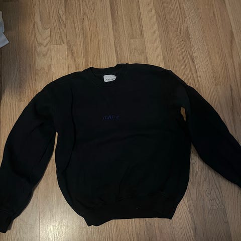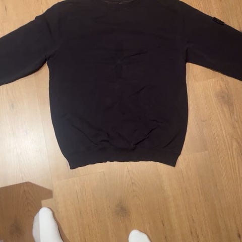 Stone Island genser for herre i størrelse M. Genseren er svart og laget av bomull. Klassisk rund hals og lange ermer. Stone Island-logo på ermet. Passer til hverdagsbruk og kan kombineres med både jeans og joggebukse.