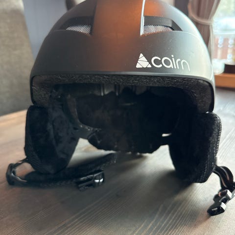 Cairn skihjelm med integrert visir i størrelse 54–56. Hjelmen har fast visir med speilglass, justeringshjul i nakken for tilpasning av passform og festestropp under haken. Farge i lilla/burgunder med lyse detaljer. Egnet til alpint og snowboardbruk.