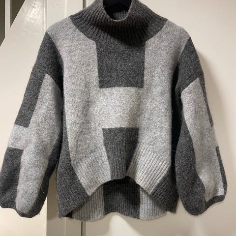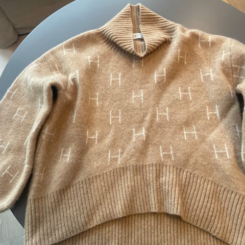HÉST høyhalset genser for dame i størrelse XS. Genseren er oransje med mønster av bokstaven H over hele plagget. Den har høy hals samt vide ermer. Passer som en varm og komfortabel hverdagsgenser i kjøligere vær.