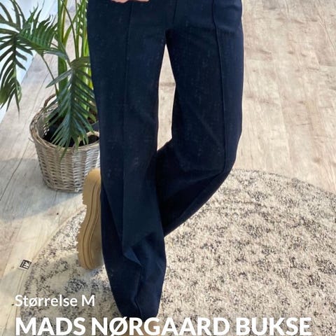 Mads Nørgaard bukser for dame i størrelse M. Buksen er svart og laget av bomull. Modellen har rette ben og pressfolder foran og bak, med klassisk linning og beltehemper. Passer til både hverdagsbruk og mer formelle anledninger, og kan kombineres med ulike topper, skjorter eller blazer.