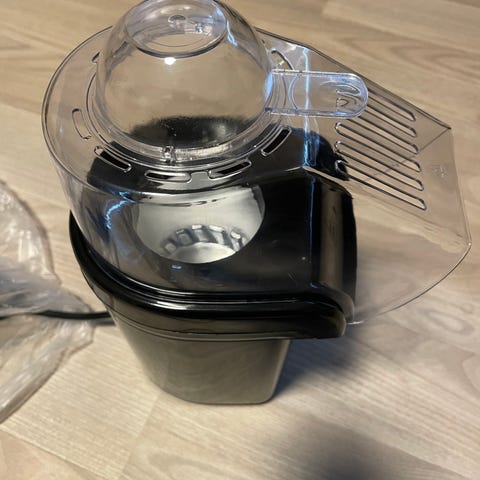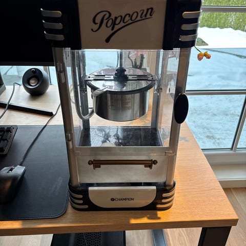 Champion popcornmaskin bordmodell i svart og sølv. Maskinen har gjennomsiktige sider, innebygd kjele i metall og håndtak for enkel tømming av popcornet. På toppen er det separate brytere for varmeelement og belysning. Egner seg til bruk på kjøkkenbenk eller bord, og passer til tilberedning av popcorn til hjemmekino, selskap eller hverdagsbruk.