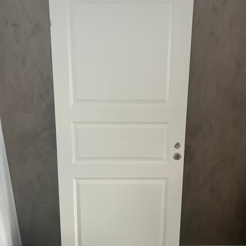 3 stk Hvit innerdør med glatt dørblad og enkel, moderne utførelse. Døren har hull for dørhåndtak og låskasse. Passer som romdør innendørs i bolig, for eksempel til soverom, bad eller oppholdsrom. Egnet for standard karm til innerdører 210x90 cm