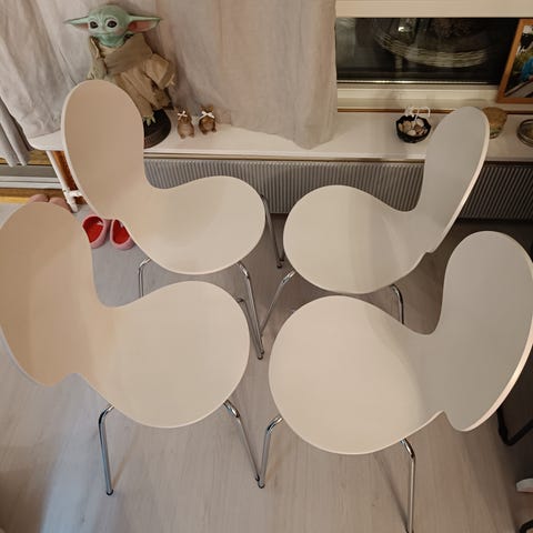 3 brukte hvite stoler for 200 kr, lite riper men ikke mye synelig
