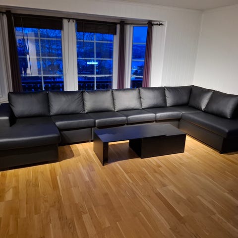 Stor 7 seters u-formet sofa i sort kunstlær.