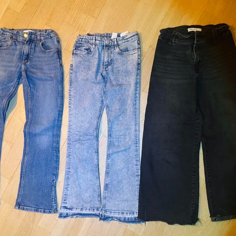 H&M glitrende og stretchy slengbukser/jeans i str 140/10 år. Buksene er i blå denim/bomull. To av dem har dekor med glitrende steiner. Lite og veldig pent brukt.