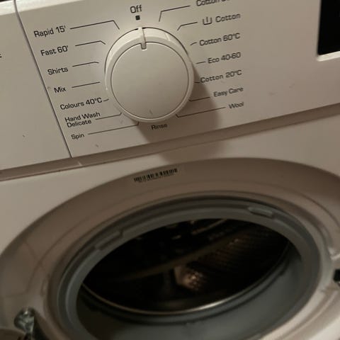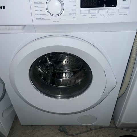Maskinen har frontåpning med glassluke og trommel i rustfritt stål. Betjeningspanel med flere programknapper for ulike vaskeprogrammer og innstillinger.
