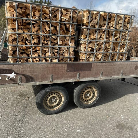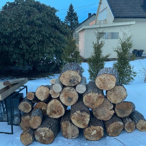 Stort grantre ferdig fellt, ligger i biter på bakken.