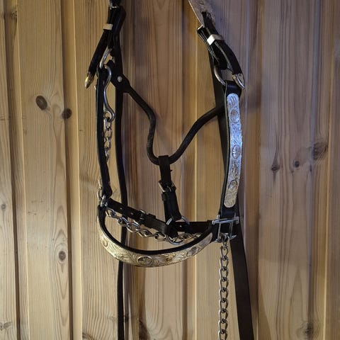 Lite brukt lærgrime i str full, med bling på nese og sidestykke. Mykt og godt lær, med polstring på nakke og nesereim. En av de store stenene på nesereimen, og to av de store stenene på ene sidestykke er borte, ellers ok.