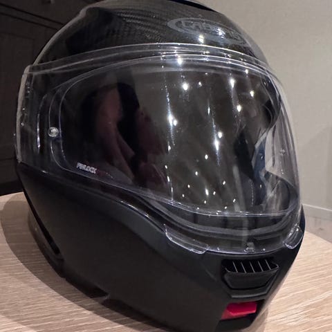 Schuberth C3 MC-hjelm i matt svart farge. Hjelmen er en åpningsbar modell med visir og pinlock. Den har integrert ventilasjon på toppen og polstret innredning rundt kinn og hode. All innmat bør byttes. Noe rust på metall. Haken kan vippes opp for enklere på- og avtagning eller ved korte stopp. Hjelmen er godt brukt og bærer preg av dette. Den har ikke vært i bakken pga fall eller lignende.