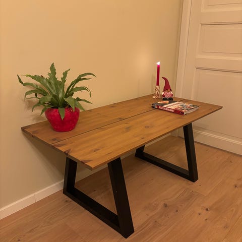 Rektangulært salongbord i tre. Bordet har avrundede hjørner og kraftige ben med tverrstag som gir stabilitet. Passer som stuebord foran sofa eller som lavt bord i oppholdsrom. Egnet til daglig bruk i stue eller tv-stue.