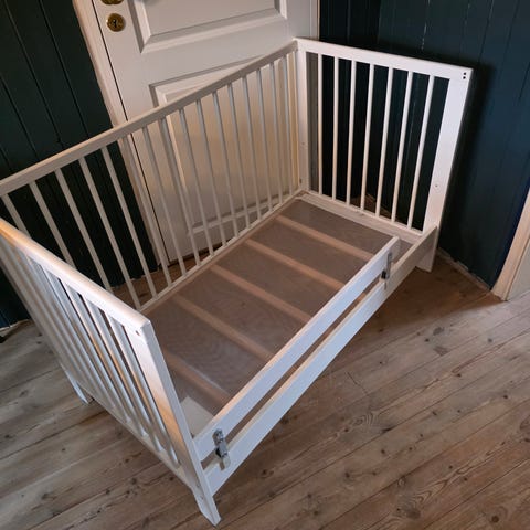IKEA sprinkelseng i hvit utførelse. Klassisk barneseng med sprosser på sidene og tette hode- og fotender. Passer til standard madrass for sprinkelseng. Egnet for små barn som trenger seng med høye kanter for trygg søvn. Sengen er laget i tre-/platekonstruksjon med malt overflate. Klistremerker er festet på endene.