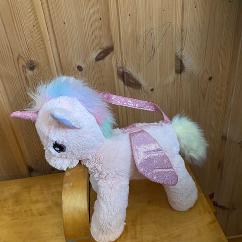 Søt og myk bamse med egen bæresele/ryggsekk 💙 Bamsen kan tas ut og settes inn igjen i selen – perfekt for små som liker rollelek og å “bære” babyen sin. Justerbare skulderstropper og glidelås på siden.