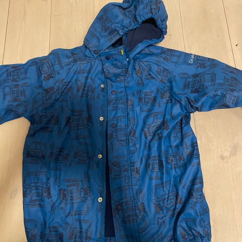 CeLaVi regnjakke og bukse i størrelse 130 unisex. Den har hette, glidelås med trykknapper i front og elastikk ved håndledd for bedre passform. Refleksdetaljer på ermene gir økt synlighet. Passer til bruk i vått vær og som ytterlag over annet tøy. Fotstrikker er ødelagt, så disse må byttes.