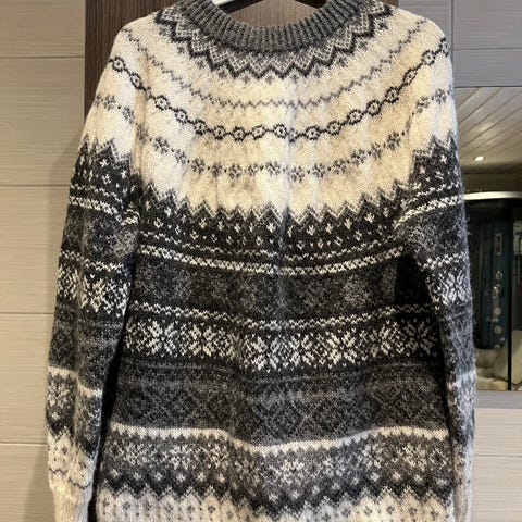 Selger en nydelig hjemmestrikket genser😊Størrelsen vil jeg si tilsvarer M. Har litt nupper.