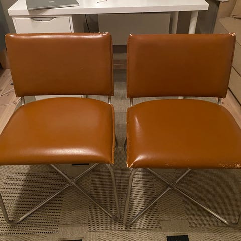 De tåler mye, er enkle å rengjøre og kan brukes både ute og inne. Disse stolene er kun brukt inne. Kan ha noen svake overflatemerker som ikke utgjør noe for funksjonen.