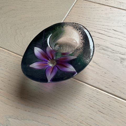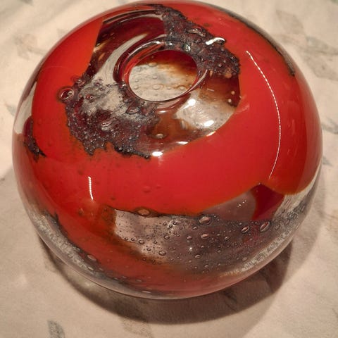 Nydelig kuleformet oljelampe i massivt glass, dyp brunlilla i fargen. Lampen har aldri vært brukt.