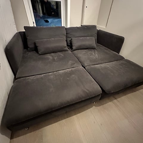 Vimle sovesofa fra 2023 med grått trekk selges. Mål sovedel: 140 x 200 cm. Sovedel er brukt under ti ganger siden ny. Sofatrekkene trenger en vask. Er demontert og satt på lager.