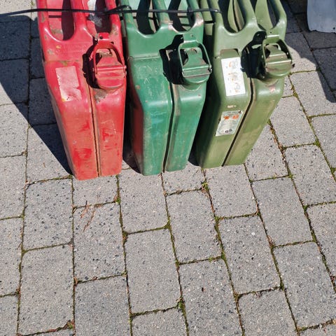 Røde bensinkanner i metall. Kannenehar bærehåndtak og mekanisk låselokk. Egnet for oppbevaring og transport av bensin eller annet drivstoff i mindre mengder. Det følger med et separat grønt påfyllingsrør som festes i åpningen ved fylling. 20 L