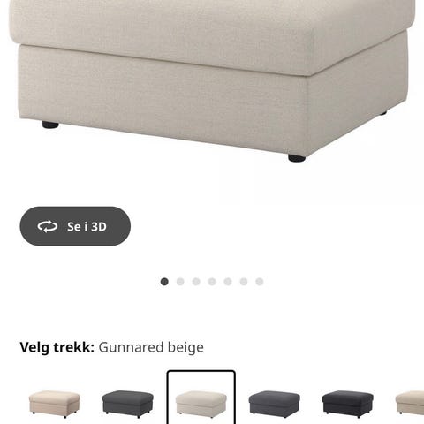Puff med oppbevaring i grått tekstil. Rektangulær sitteflate med lokk som kan åpnes for tilgang til oppbevaringsrom under. Egnet som ekstra sitteplass, fotskammel eller som møbel med skjult lagringsplass i stue, soverom eller gang.