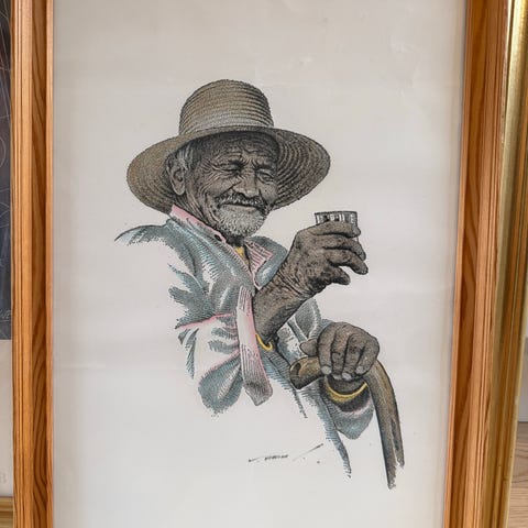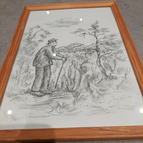 Vebjørn Sand «Bonden» innrammet bilde. Motiv av en eldre mann som står i vann med stokk. Bildet er montert med passepartout og innrammet i en lys/gullfarget ramme. Informasjon om kunstneren er festet på baksiden via etikett fra Solberg Bilder A/S. Egner seg til oppheng på vegg i stue, gang eller andre oppholdsrom.