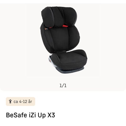 BeSafe iZi Up X3 Fix bilstol for barn opptil 36 kg. Bilstolen har høy rygg med justerbar hodestøtte og sidebeskyttelse. Den monteres med ISOfix-fester kombinert med bilens trepunktsbelte. Setet har belteføring som hjelper til med korrekt plassering av bilbeltet over skulder og hofte. Trekket er i mørk, svart tekstil. Egnet som framovervendt beltestol til større barn innenfor godkjent vekt- og høydeområde i henhold til produsentens anvisninger.