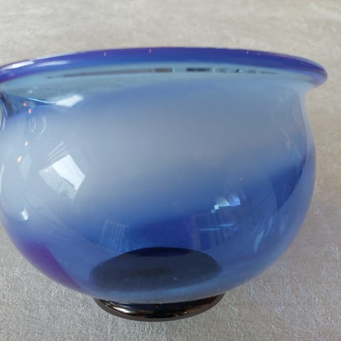 Denne skålen er tung, utformet i massivt glass med nydelig fargespill. Passer til både smågodt, en liten rose i en skvett vann, eller som pynt i seg selv.