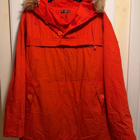 Kuul og deilig anorakk i str 42. Den har hette med "pels" kan taes av, stor lomme i front og kan snøres helt nede. Den har en flekk på ene skulderen, se bilde, men jeg trur ikke dette er så iøynefarende, og mulig kan man vaske det bort.... Pga dette selges den rimelig.