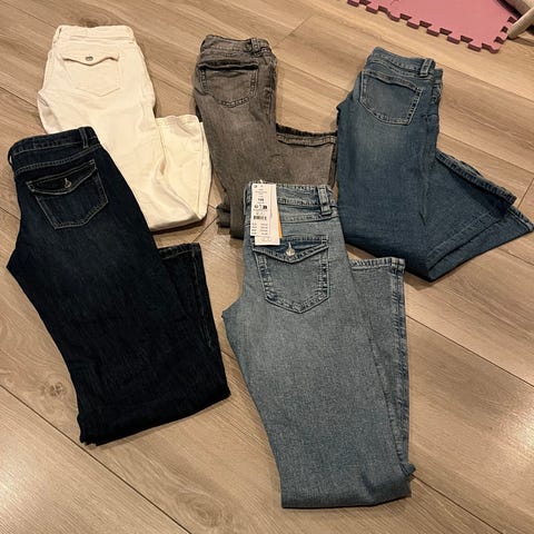 Pent brukte jeans, noen med rette ben. Den fra Lindex har litt sleng. Str 27 og 36.