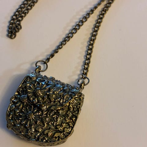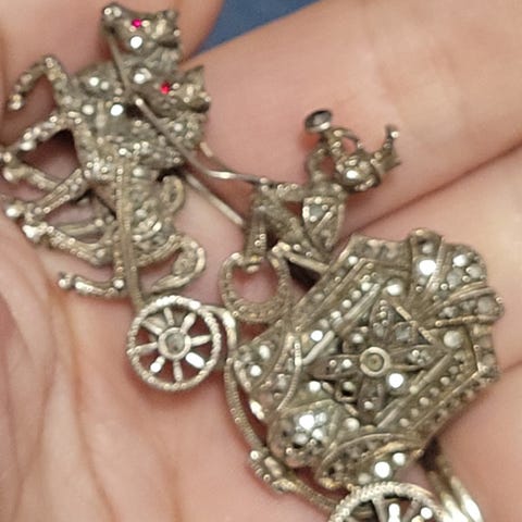 Anheng formet som en vogn. Anhenget har dekorative røde steinlignende detaljer og henger i en kjede. Se bilder for str.