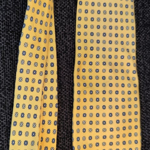 Håndlaget i høy kvalitet Prochownick slips for herre. Klassisk modell med skrå striper i gult på blått, småmønstret bunn. I 100% silke. Fra Italia Milano ..Slipset har standard bredde og lengde, egnet til bruk med dress og skjorte ved formelle og uformelle anledninger. Materialet fremstår som vevd tekstil med jevn struktur. Passer til herreantrekk der man ønsker et mønstret slips i gule og blå toner.