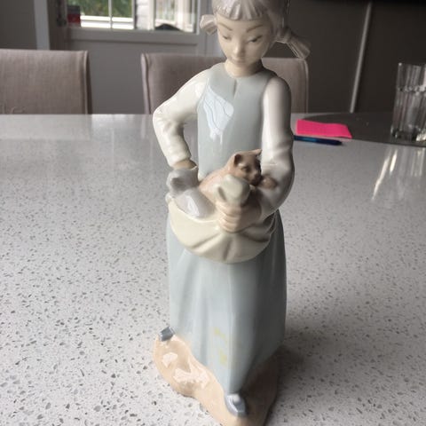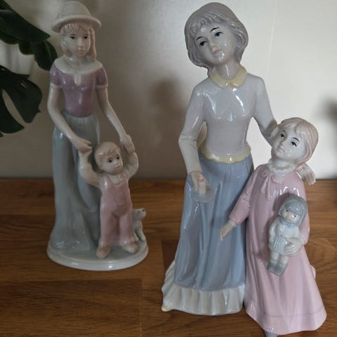 Nao porselensfigur som forestiller to gutter stående side om side. Figurene er kledd i lyse kjortler med blå krage og blå bukser. Utført i glasert porselen med glansfull overflate.