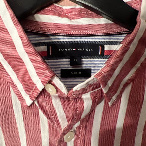 Tommy Hilfiger skjorte for herre i størrelse M. Skjorten er laget av bomull og har flerfargede vertikale striper i blant annet rødt og blått på lys bunn. Modellen har lang erm, klassisk krage og knappelukking foran. Det er brystlomme med liten Tommy Hilfiger-logo. Passer til både hverdagsbruk og mer formelle anledninger.