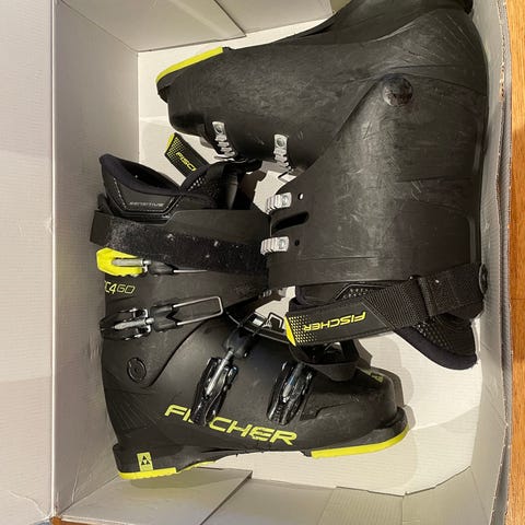 Lite brukt Fischer alpinstøvler i svart med gule detaljer. Støvlene har flere justerbare spenner i metall foran for god tilpasning rundt fot og legg.
