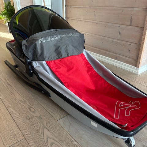 Fjellpulken barnepulk med vindskjerm i grå og rød farge. Justerbare seterygger med sele til barna. Egnet for transport av barn på ski- og vinterturer. Pulken har lav profil og langsgående meier for stabilitet på snø. Passer til bruk sammen med standard Fjellpulken-drag og sele, disse følger ikke med. Har alltid vært lagret innendørs.
