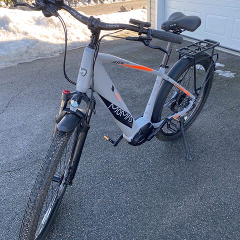 Elsykkel med 26" hjul i rød farge. Sykkelen har lavt innsteg i rammen, bagasjebrett bak og rette styre. Passer til hverdagsbruk og pendling. Sete og styre kan justeres i høyde for tilpasning til bruker. Den mangler batteri som kan kjøpes til 2700NOK i butikk.