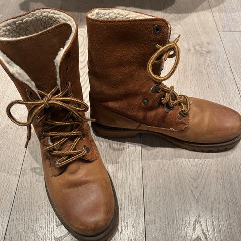 Roots vinterstøvler i størrelse 42. Støvlene er laget i brunt skinn med grov gummisåle. Innvendig er de fôret med lys, myk tekstil som gir ekstra varme. Modellen er ankelhøy med glidelås på siden for enkel av- og påtaking. Passer til bruk i kaldere vær og på underlag der det trengs bedre grep.