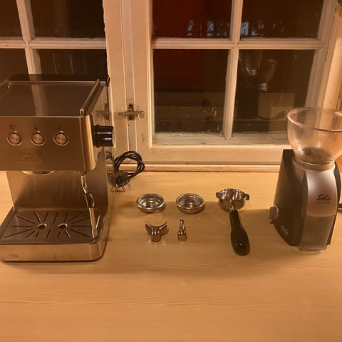 Med følger også en god kvern, men motoren på den har blitt litt svakere, så den funker best på mørke bønner.