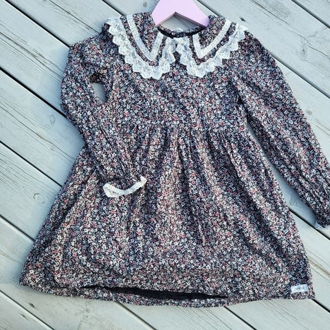 Newbie kjole for barn i størrelse 80. Kjolen er laget av bomull og har flerfarget småblomstret mønster. Modellen har lange ermer og en markert krage med blonde- og bånddetaljer. Passer til jente og kan brukes til både hverdags og mer pyntede anledninger.
