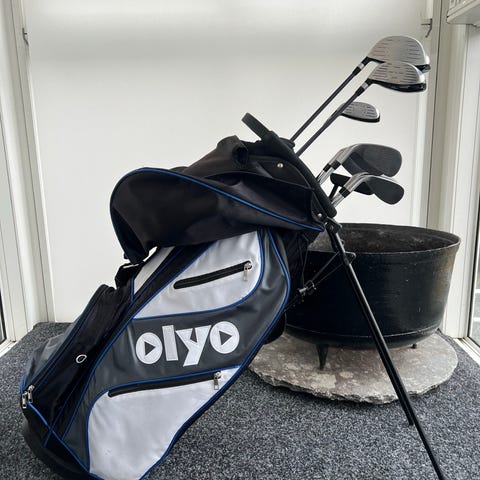 Olyo golfsett damejern med bærebag i grå og blå farger. Sett med flere golfkøller, inkludert driver, fairwaykøller og jern, med skaft i grafitt og metall. Golfbagen har flere lommer med glidelås for oppbevaring av tilbehør, blant annet lomme der det ligger golfballer. Egner seg for spiller som ønsker et komplett sett med køller og bag til bruk på golfbanen.