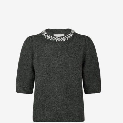 Neo Noir genser for dame i størrelse 40. Genseren er beige og har halvlange ermer og rund hals. Rundt halsen er det dekorative steiner/perler som gir en markert krage. Ribbestrikkede kanter på ermer og nederkant. Materiale ifølge merkelapp: hovedsakelig polyesterblanding. Passer til hverdagsbruk eller mer pyntede anledninger.