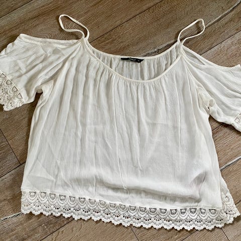 H&M bluse for dame i størrelse L. Blusen er hvit og laget av polyester. Den har korte volang-ermer, rund hals med knyting foran og dekorative blondedetaljer på brystpartiet. Rett passform og lett, vevd stoff som faller løst. Passer til hverdagsbruk og kan kombineres med både bukser, skjørt og shorts. Veldig fin til oversized look, bare prøvd aldri brukt. PRIS KAN DISKUTERES