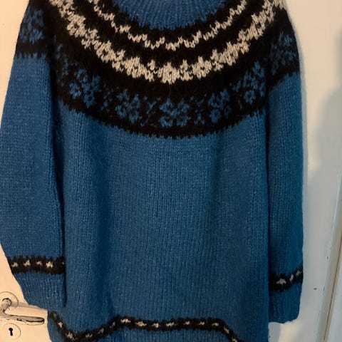 Varm ullkjole i nydelige blåtoner. Pyntet med paljetter.