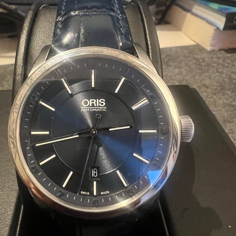 Mekanisk klokke med dag og dato selges. Følger med svart skinnreim og boks den kom i. Lite brukt klokke som framstår som ny.