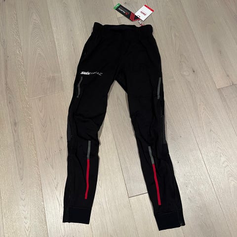 Björn Dæhlie langrennsbukse for dame i størrelse S. Liten i størrelsen, ville kanskje heller sagt XS. Buksen er hovedsakelig svart med gule felt nederst på beina og refleksdetaljer. Den har elastisk linning. Egnet som treningsbukse til langrenn og annen utendørs aktivitet i kjølig vær.
