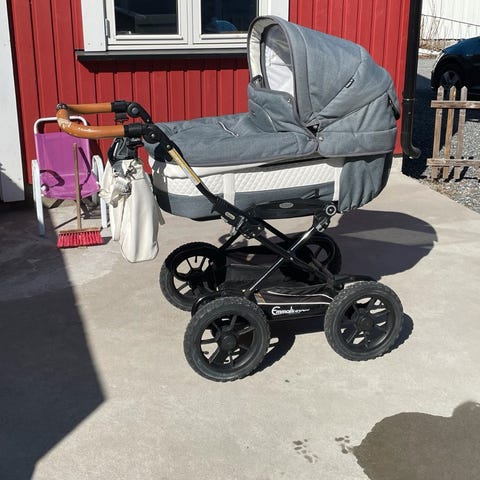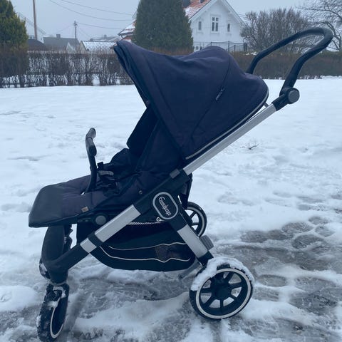 Vognen er i god stand, det eneste er at håndtaket på vognen er slitt (se eget bilde). Det følger med liggedel, sportsdel, regntrekk, myggnetting og solskjerming. God plass til oppbevaring under vognen er det også!