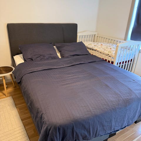 Den ene av sengekantene kilte seg fast ved montering og er derfor kun skrudd fast i 1 av 2 skruer, men den sitter allikevel fast. De andre kan flyttes på ved behov (mulig andre en meg kan få av den siste og💪🏼)