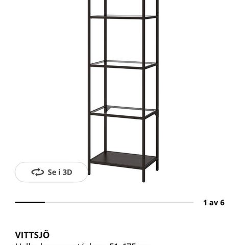 Vittsjö hylle fra IKEA. Rammeverket er i sortlakkert metall, midtplaten i glass og topp- og bunnplaten i mørkebrunt tre. Hyllen er pent brukt og i god stand, og fremstår med få til ingen bruksmerker.