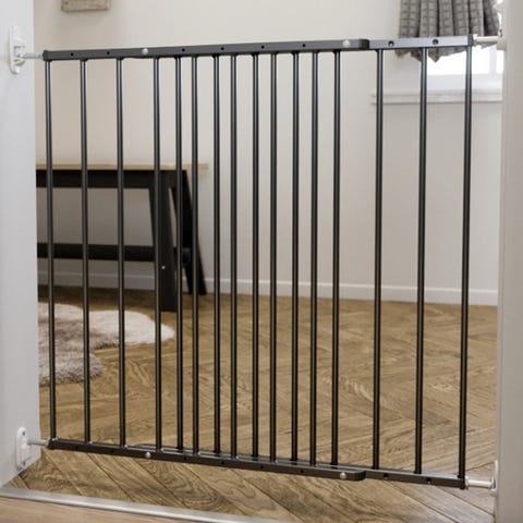 Hvit sikkerhetsgrind i metall til montering i døråpning. Festes i veggen uten skruer, og kan tilpasses ulike lengder. Opp til 108cm lang. Grinden er ca 60cm høy.
