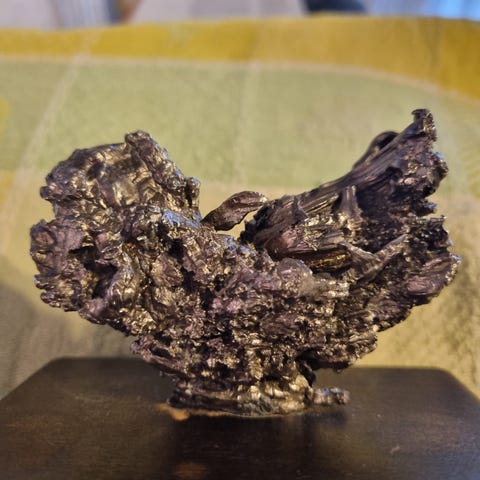 Kuleformet larvikitt stein dekorasjon i stein med tilhørende sokkel. Overflaten er polert og har et mørkt, marmorert uttrykk med lyse innslag. Sokkelen er avrundet og tilpasset kulens form, slik at den står stødig. Egner seg som innredningsdetalj på hylle, bord eller skjenk i stue, kontor eller andre oppholdsrom.