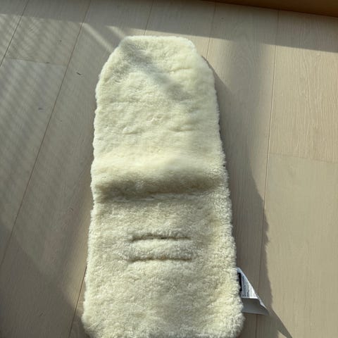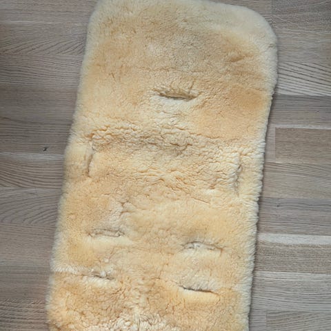 Pent brukt saueskinn med hull til 5punkssele. Vi har alltid brukt dette under vognposen. Ble vasket før vi ryddet det bort.